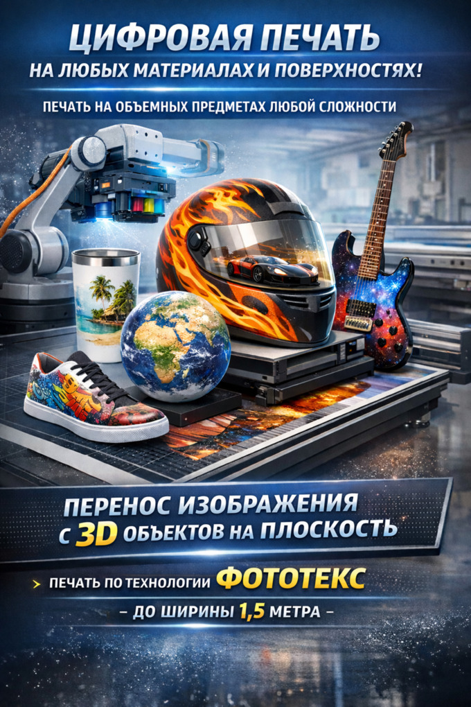 Обеспечиваем печать и перенос изображений с трехмерных объектов на плоскость и с плоскости на объемные предметы по технологиям фототекс, что позволяет качественно воспроизводить графику на объемных материалах и плоских изделиях шириной до 1,5 метра.